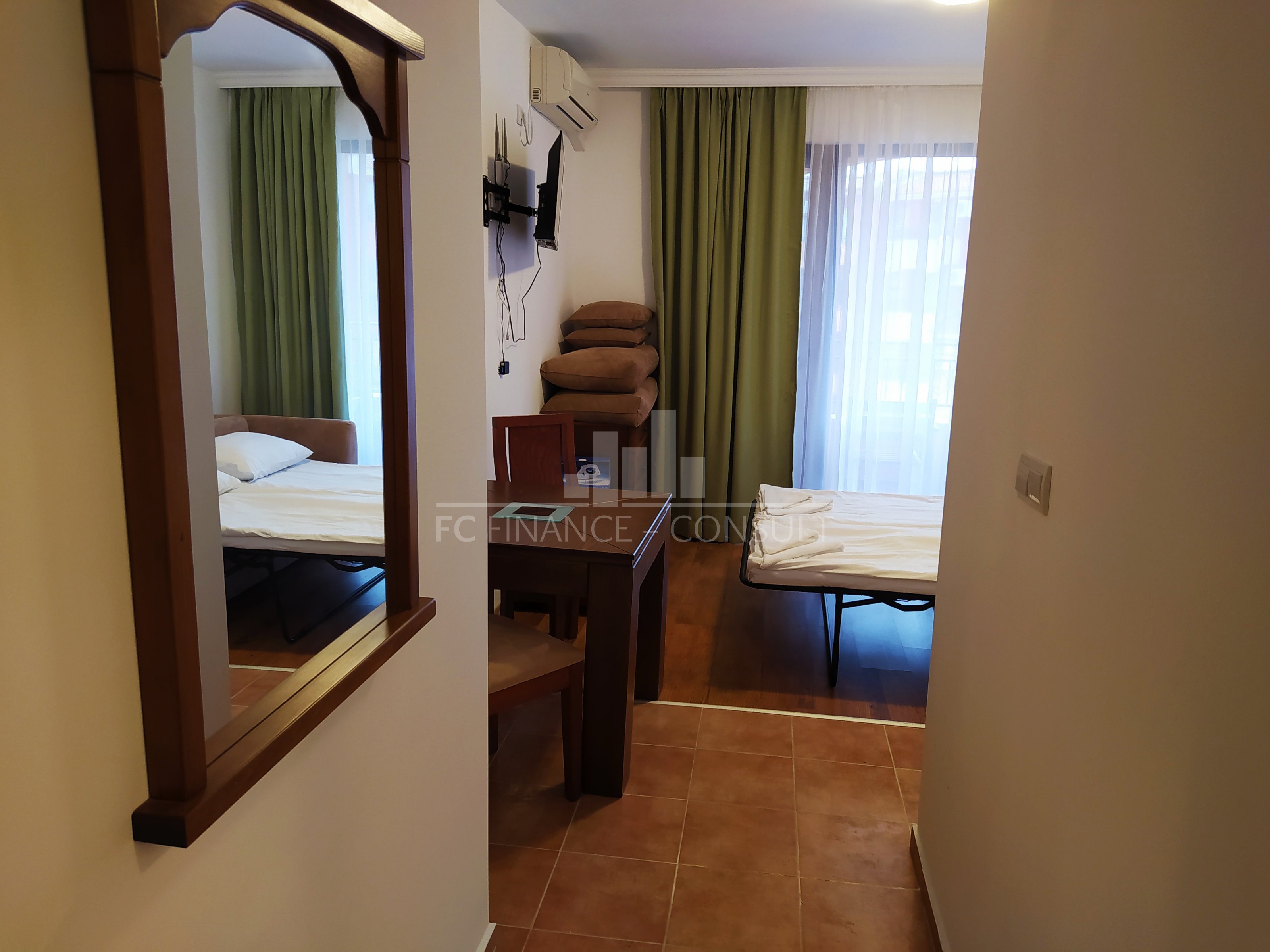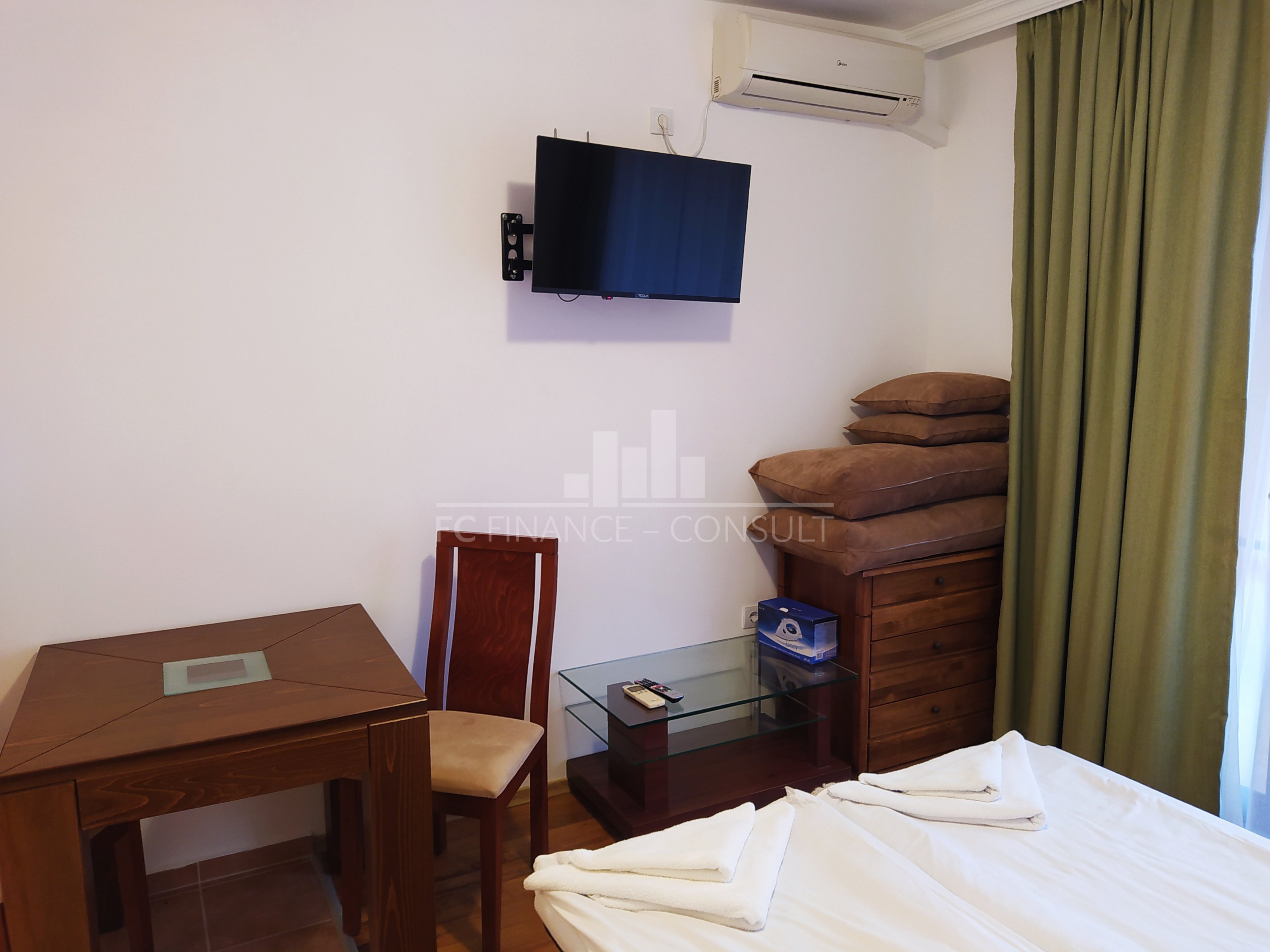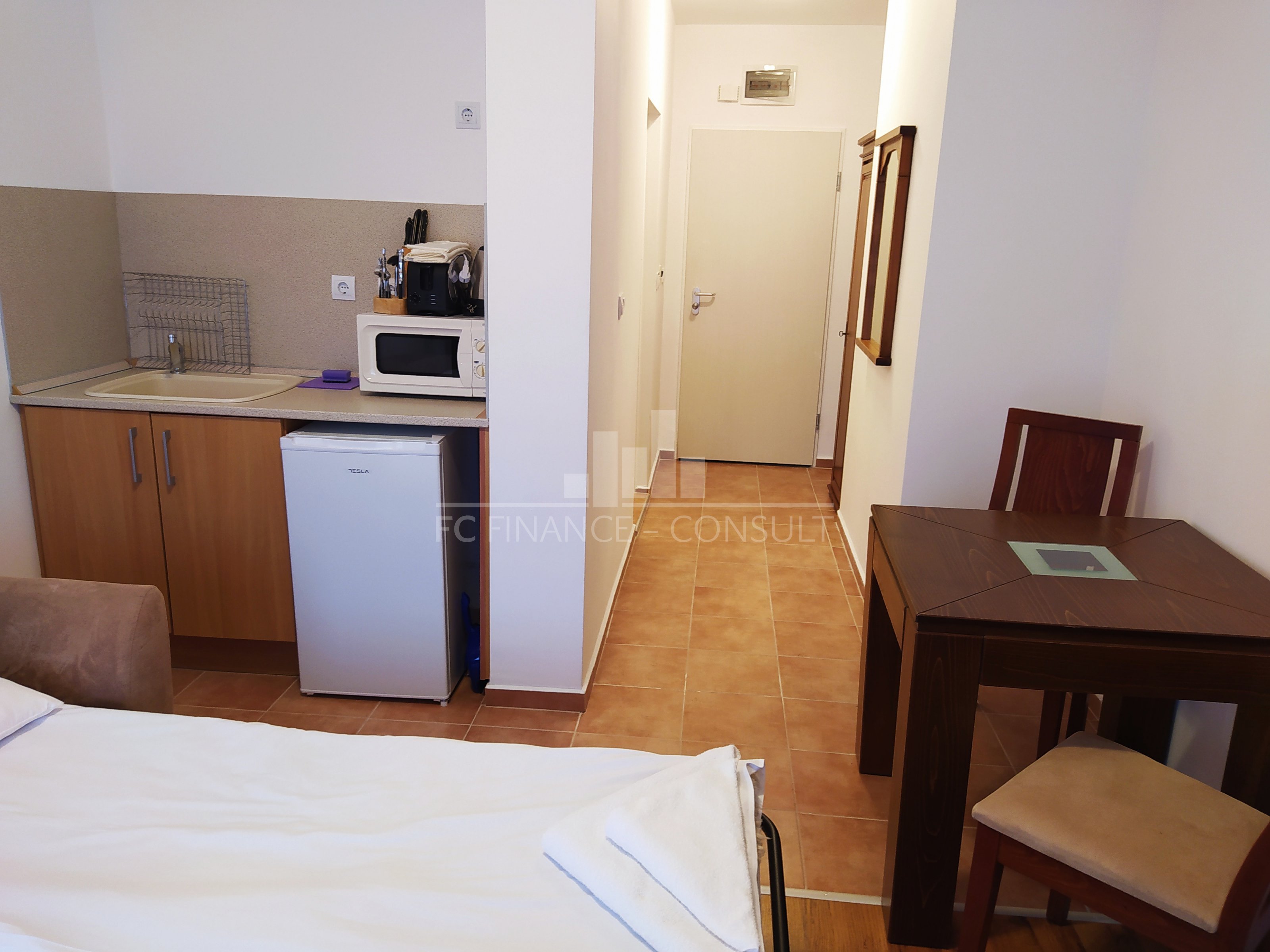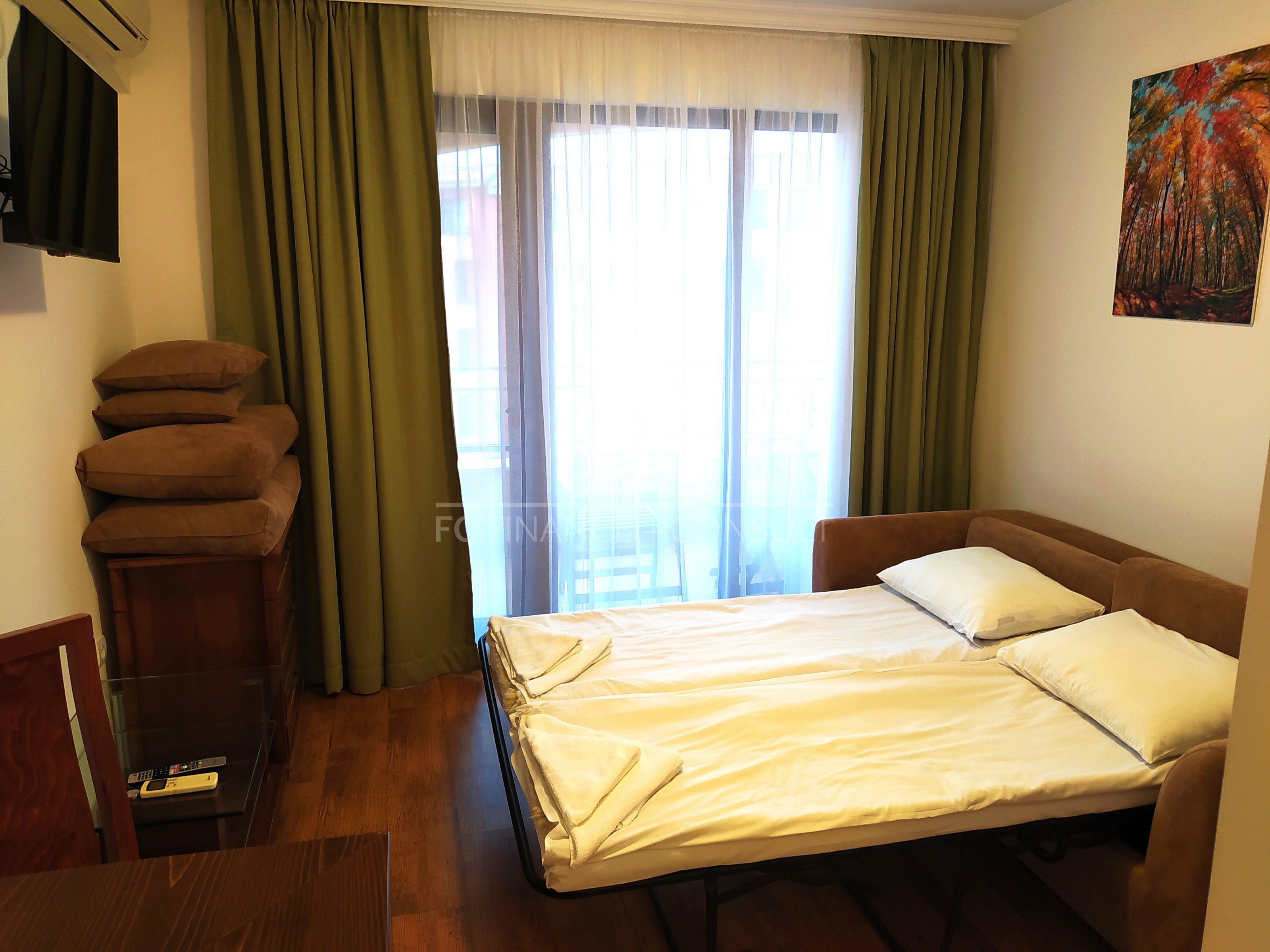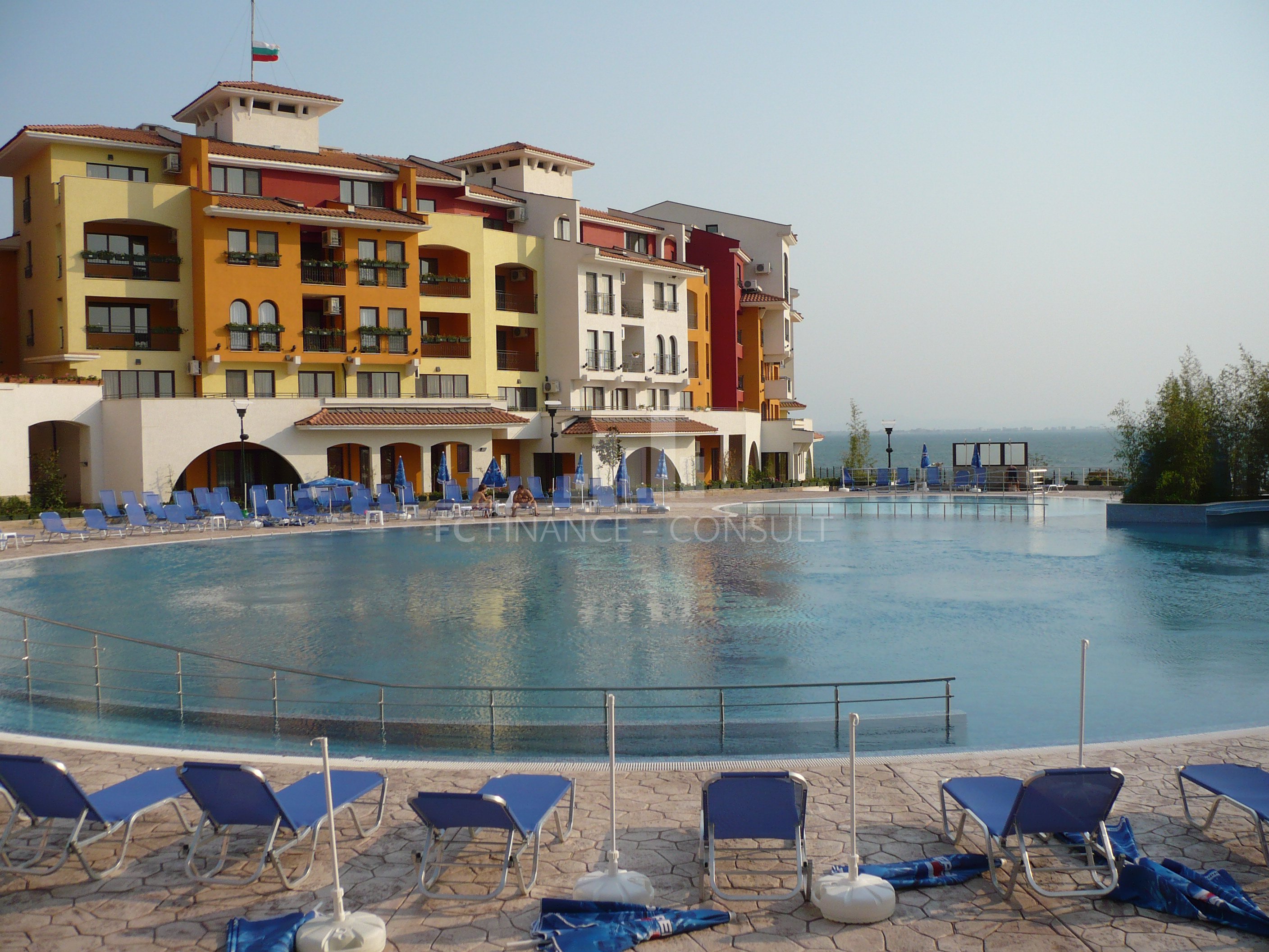 The sea and pool view studio apartment with a a floor area of 34 m2 is situated in a private fully equipped holiday complex on the 4th floor of a five-storey house in a beautiful and quiet location Aheloy in the Gulf of Burgas, near the healing mud of Pomeranian salt flats. This resort is not very famous, it stays away from the crowds of tourists and offers a peaceful holiday by the Black Sea. The resort is a 15-minute drive from Burgas Airport and is located directly on one of the beaches, which also has a small marina with yachts and fishing boats. The holiday complex is built on 40,000 m2 area and consists of 4 individual areas / parts. Marina, Cove, Tower and Lighthouse form the original concept of each of its 750 apartments. In the whole area you can use 4 restaurants, many cafes and bars, 2 swimming pools with water bars, spa, sports center, squash courts, wellness and SPA center, massages, general practitioner s office, supermarket and several others smaller shops with a diverse offer of various goods. High-speed internet and cable TV are also available in each apartment. The property is suitable for your own rest and recreation and also as an investment for rent. It is a unique possibility of summer living in a beautiful and pleasant environment.